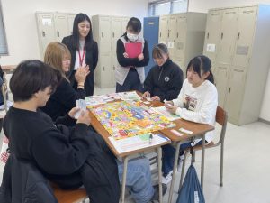 「体験しよう介護の授業」ということで、レクリエーションを行いました。パラリンピックの正式種目であるボッチャの体験では、参加者と学生でチームを組み対戦しました。次に、車いすを使用したゲームを行いました。車いすの使用方法を説明した後、コースを周りながら的あて等のゲームを体験していただきました。